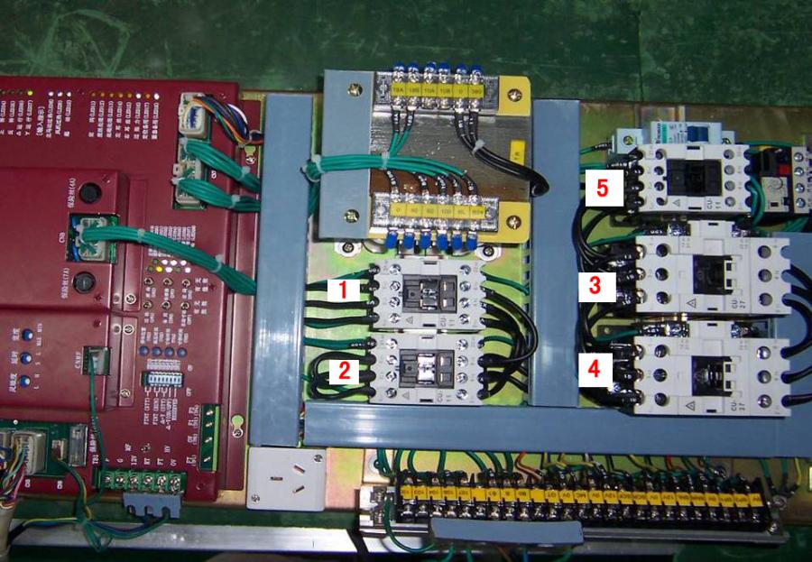 上圖中,1#、2#接觸器主要用于控制電機星-三角啟動,3#接觸器主要用于控制電機正轉起動(即織機正常起動),4#接觸器主要用于控制電機反轉點動(即織起正常起動前絲線位置的調(diào)整),5#接觸器+熱繼電器主要用于控制風機。