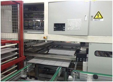 排版機把串焊機輸送過來的電池串(有正負(fù)極之分)按照設(shè)定好的正負(fù)順序進行取片、校正,然后放到按照設(shè)定的距離排到EVA覆膜后的玻璃上。