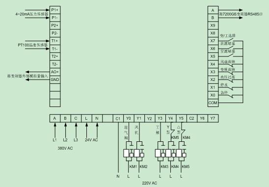 空壓機(jī)是各種工廠、筑路、礦山及建筑行業(yè)的必備設(shè)備,主要用來提供源源不斷的具有一定壓力的壓縮空氣,例如給氣動(dòng)閥供氣,給需要一定壓力氣體的工藝流程提供氣源??諌簷C(jī)有很多種類,如螺桿式空壓機(jī)、活塞式空壓機(jī)、離心式空壓機(jī)、渦旋式空壓機(jī)等等,而螺桿式空壓機(jī)的市場(chǎng)潛力極大,并在很多行業(yè)得到廣泛的運(yùn)用??諌簷C(jī)在其控制中采用加載—卸載閥來控制空壓機(jī)的供氣,由于用氣設(shè)備的工作周期或是生產(chǎn)工藝的差別,使得用氣量發(fā)生波動(dòng),有時(shí)會(huì)造成空壓機(jī)頻繁加載、卸載??諌簷C(jī)卸載后仍然工頻運(yùn)轉(zhuǎn),不僅浪費(fèi)電能而且增加設(shè)備的機(jī)械磨損,并且加載是是一個(gè)突然的過程,會(huì)對(duì)設(shè)備和電網(wǎng)造成較大的沖擊。因此對(duì)空壓機(jī)進(jìn)行變頻改造具有改善電機(jī)的啟動(dòng)和運(yùn)行、減少設(shè)備的機(jī)械磨損、在一定范圍內(nèi)節(jié)約電能等效果。本文主要講述臺(tái)安空壓機(jī)控制器與東元7200GS變頻器組成的控制系統(tǒng)在螺桿式空壓機(jī)上的應(yīng)用。