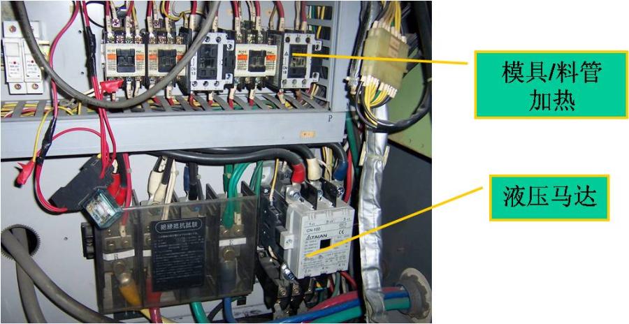 2. 接觸器的應(yīng)用,主要是用于料管加熱及液壓馬達(dá)控制兩種。