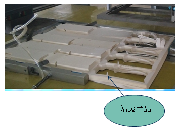 1.采取機(jī)械頂針排廢方式。模架下壓固定住材料,然后通過油缸將頂針頂出,沖出成品,功率較大,對(duì)材料較厚的產(chǎn)品有很好的清廢效果。